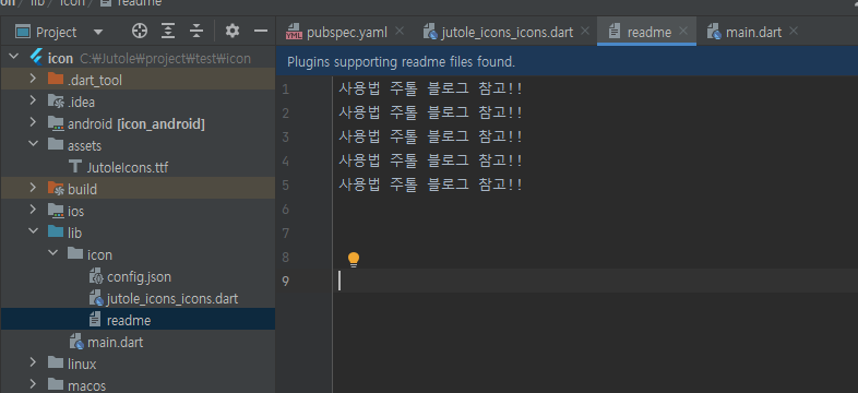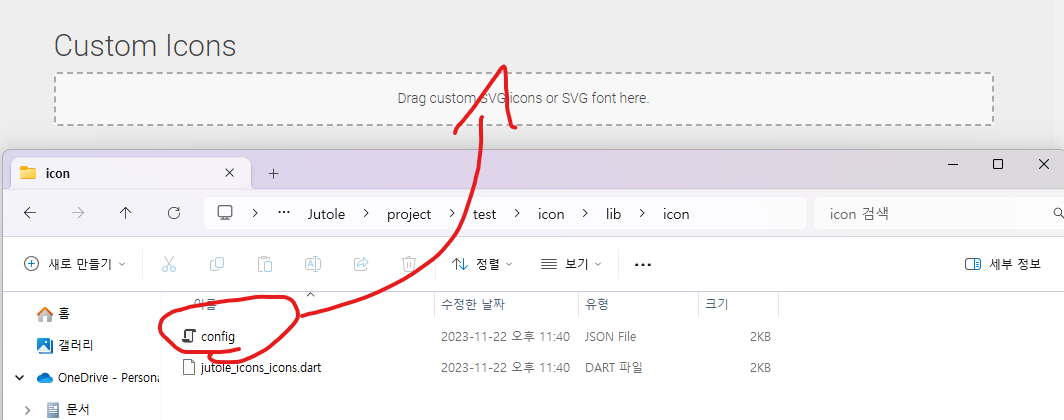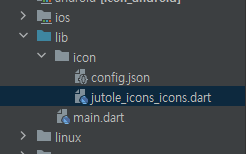 lib 폴더 하위에 config 파일과 dart 파일을 넣어줍니다. 원하시는 위치에 넣으시면 됩니다. 저는 따로 icon이라는 폴더를 생성해서 안에 넣어줬습니다.