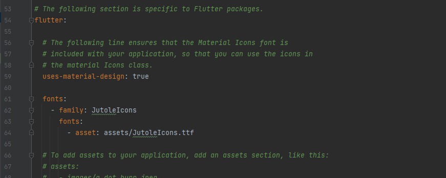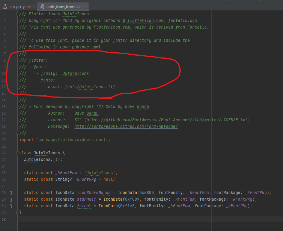아까 넣어준 dart파일을 열어보아요. 친절하게 적용법이 나와있죠? pubspec.yaml 파일에 가서 해당 부분을 넣어주시면 됩니다.