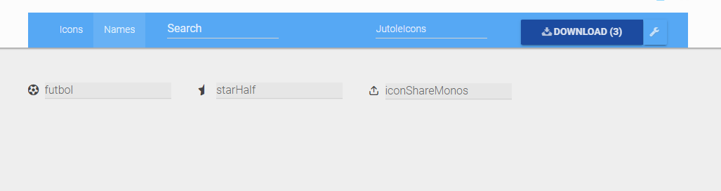 Names칸에 들어가면 선택한 아이콘들의 이름을 설정할 수 있습니다. 여기에 적용되어 있는 이름 그대로 사용되기 때문에 해당 부분을 Camel Case로 바꾸어 주어야 합니다.