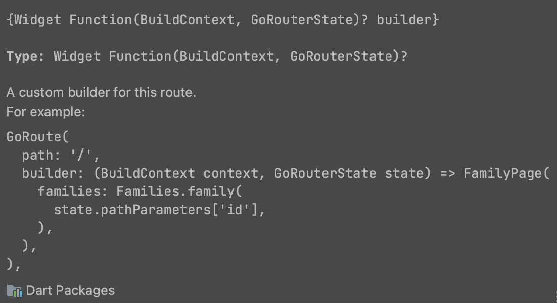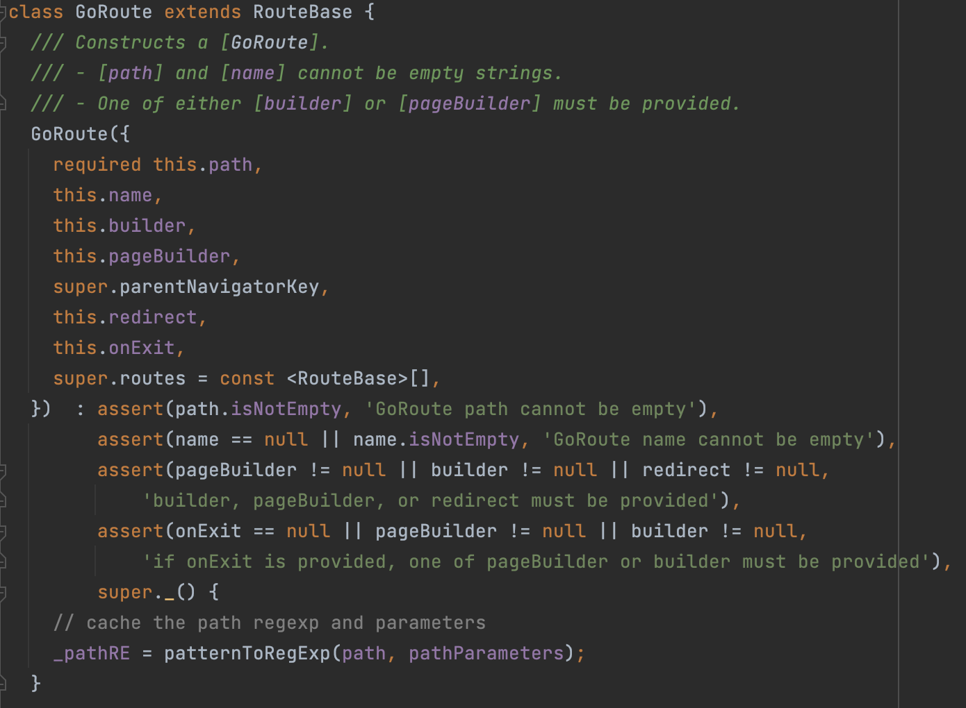 해당 코드처럼 routes에 Goroute클래스 객체를 생성하여 넣어주는 모습입니다. GoRoute에 필수 인자로써 path를 받게 되어 있습니다.