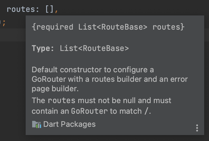 GoRouter 클래스는 필수 인자로 routes라는 인자를 필수로 받고 있습니다. 그리고 앞으로 go_router의 모든 라우팅 설정은 해당 GoRouter클래스 안에서 설정합니다.