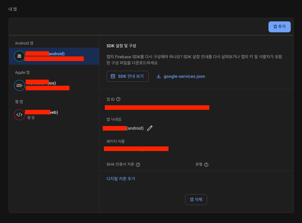 Firebase -> 프로젝트 설정 -> 내 앱 -> Android -> 디지털 지문 추가
