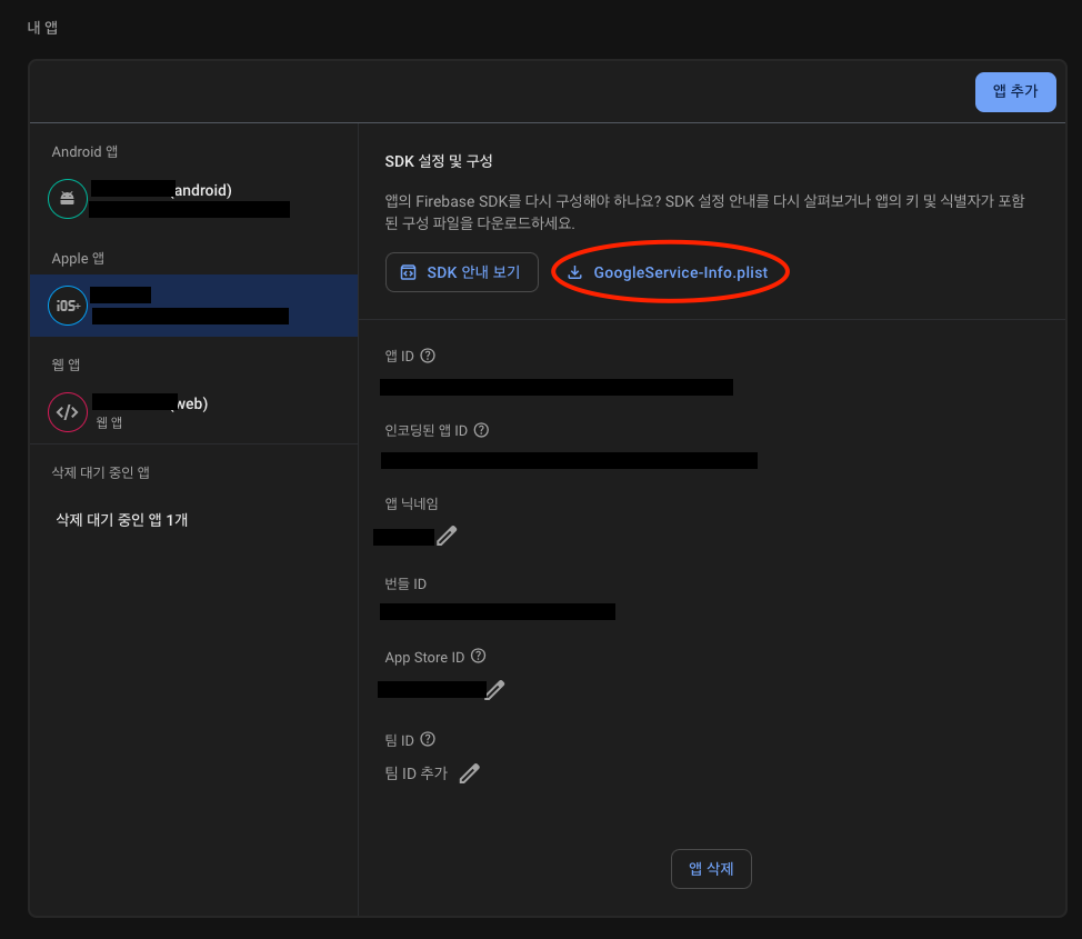Firebase -> 프로젝트 설정 -> 내 앱 -> iOS -> GoogleService-Info.plist 파일을 다운로드하여 줍니다.