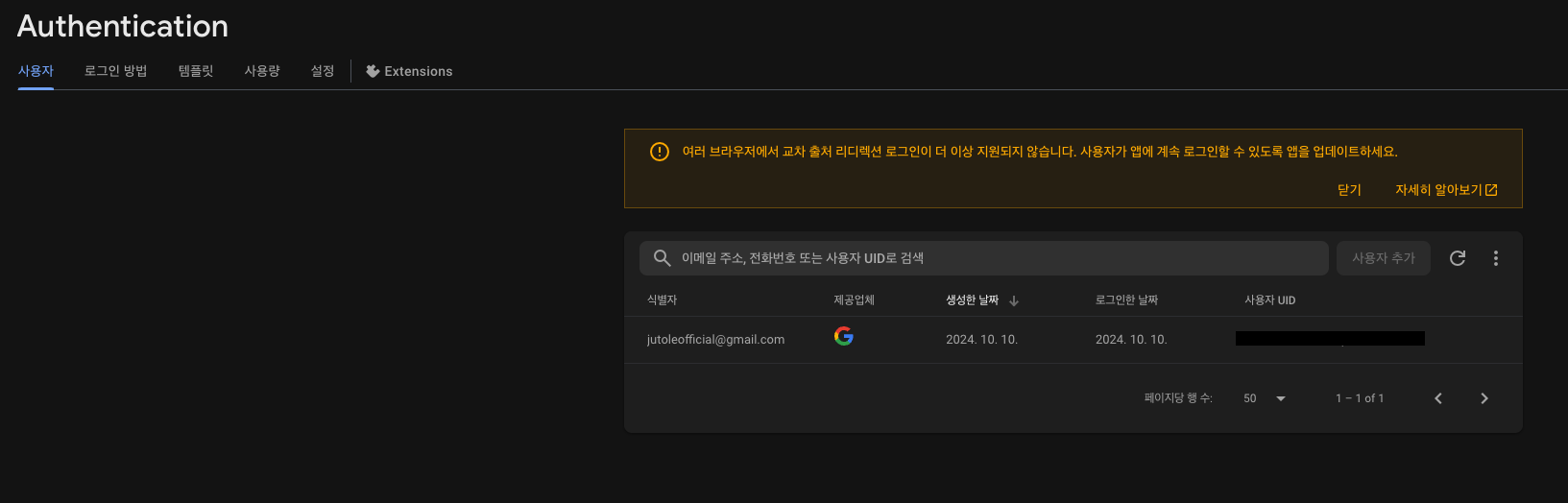 로그인을 성공하고 나면 Firebase에서 위에 사진처럼 SocialLogin 한 유저를 확인할 수 있습니다.