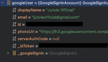 구글 로그인 화면을 열고 로그인을 진행합니다. 사용자가 로그인을 진행하지 않고 복귀 시에는 null을 반환합니다. 사용자가 로그인을 진행하였으면 아래와 같은 정보들을 가지고 옵니다.