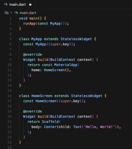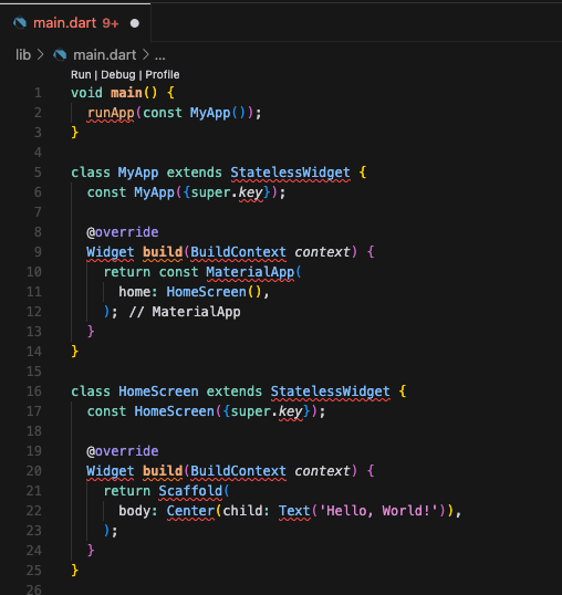 main.dart의 모든 코드를 지우고 시작해 보겠습니다.