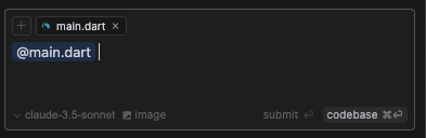 채팅창에 @(symbol)을 입력하면 여러 옵션들이 뜹니다. 저는 Files를 눌러서 main.dart를 지정해 보겠습니다.