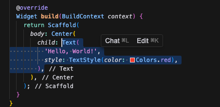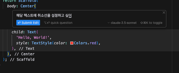 이제 Composer라는 기능을 사용해 보겠습니다. 이전 글에서 잠깐 설명드렸지만 Composer는 코드에 바로 적용시켜 줍니다. "Command + i"를 누르면 Composer를 열 수 있습니다. 여기서도 똑같이 위에 사용한 @(symbol) 기능을 이용해서 main.dart파일의 "Hello, World!" 텍스트의 색상을 빨간색으로 변경해 달라고 해보겠습니다.