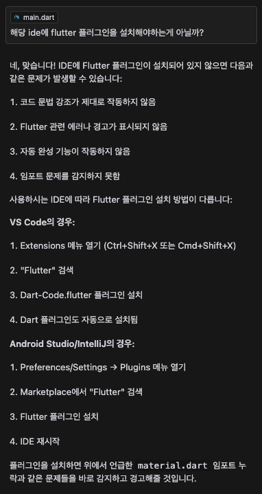 그럼 이렇게 main.dart 파일이 지정됩니다. 이렇게 되면 ai에게 질문할 때 해당 파일의 코드를 기반으로 질문하기 때문에 더 확실한 정보를 얻을 수 있습니다.