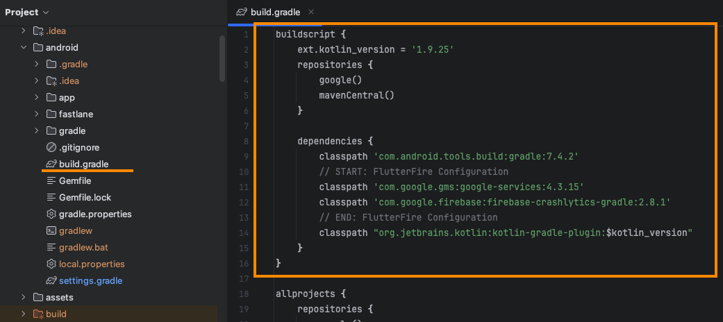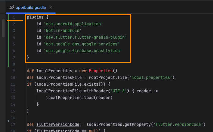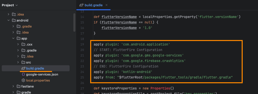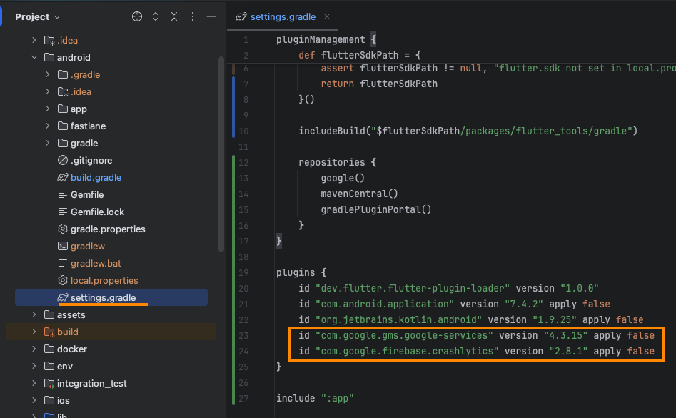 5번에서 gms.google-serviced와 firebase.crashlytics를 사용했다면 android -> settings.gradle에 해당 부분을 추가해줍니다.