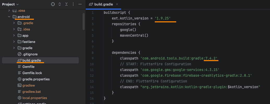 android -> build.gradle 파일에서 AGP버전과 Kotlin버전을 찾아내야 합니다.