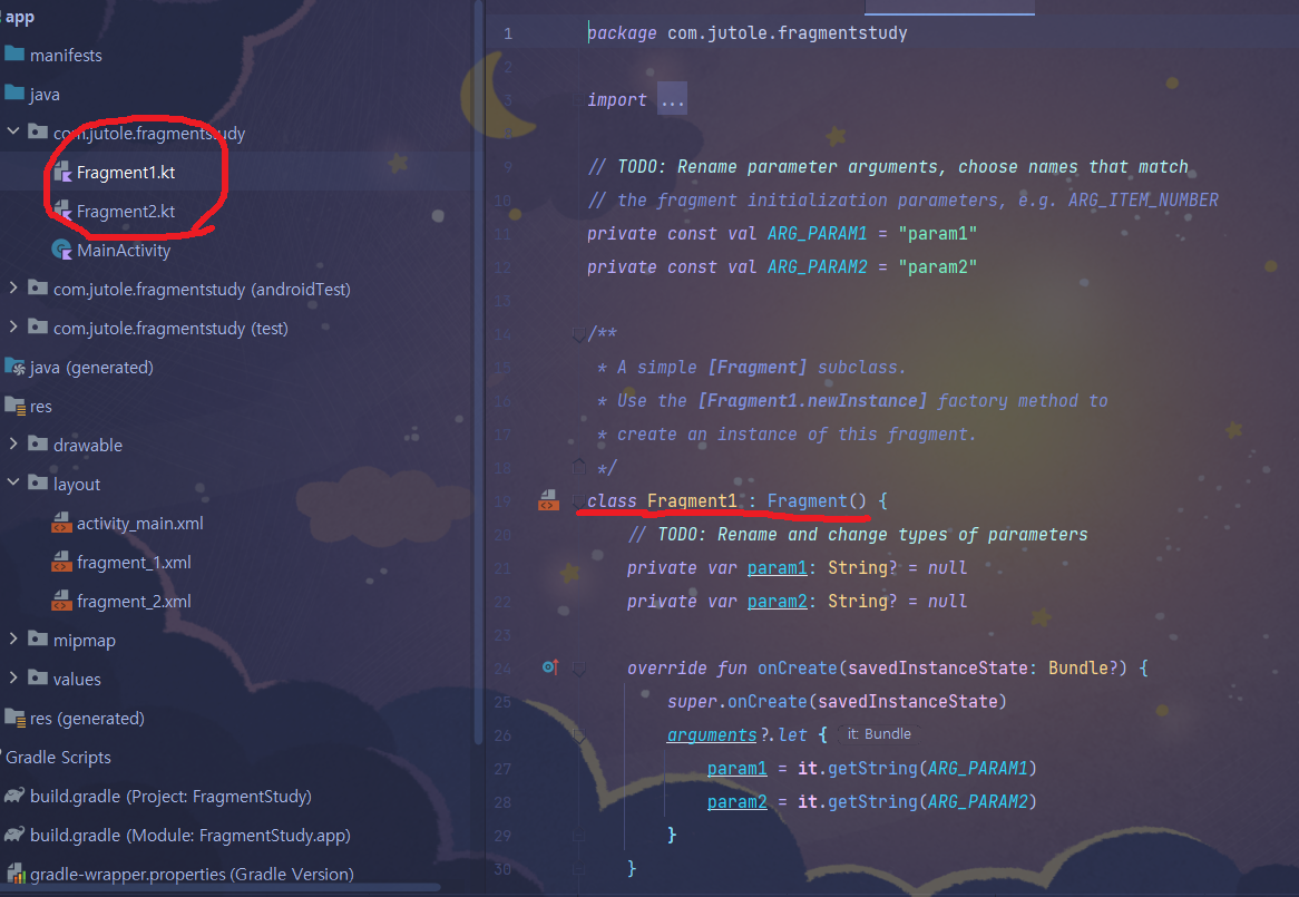 이겁니다. 잘보시면 Fragment1은 클래스 형식으로 만들어져있습니다. Fragment를 상속받았구요.
