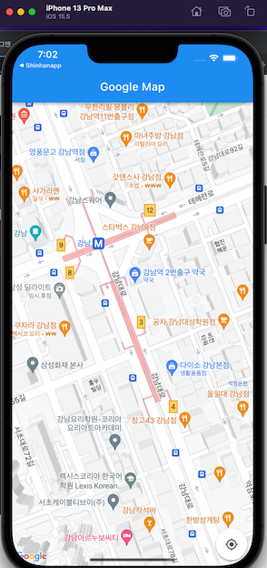 그리고 실행해보면 설정한 강남역 기준으로 구글 맵이 보인다.
