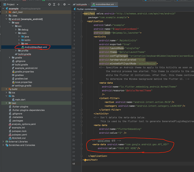 그리고 "YORE KEY HERE" 에 발급 받은 Google map api key 를 넣는다.