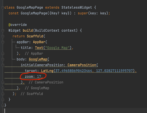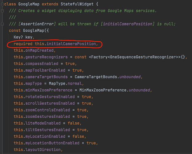 GoogleMap 위젯을 살펴보면 필수 생성자로 initialCameraPosition 을 받는다.