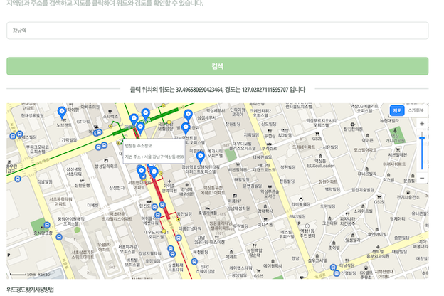 해당 사이트에서 찾고싶은 위치를 검색후 클릭하면 위도 경도를 확인 할 수 있다.