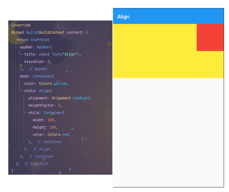 Align 위젯의 속성에는 alignment말고 heightFactor / widthFactor 라는 속성이 추가로 있습니다.