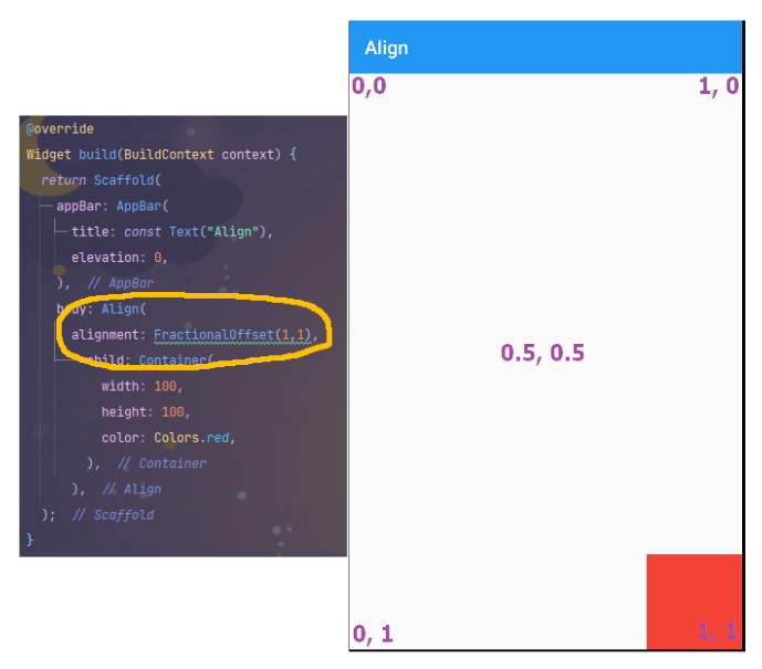 간단하게 설명하자면 Align 위젯은 부모를 기준으로 자식을 배치시킨다고 하였습니다.