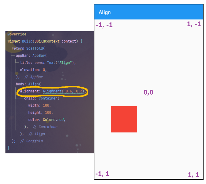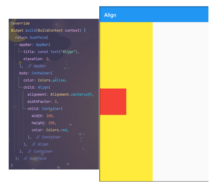 Align({Key? key, AlignmentGeometry alignment = Alignment.center, double? widthFactor, double? heightFactor, Widget? child})