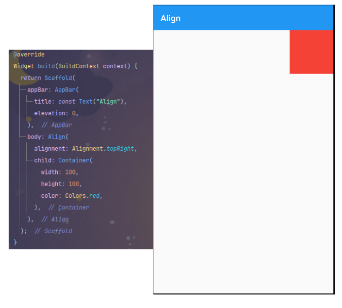 코드에서 보시다시피 Container을 Align 으로 감싼 후에 배치를 하는 속성인 alignment 를 사용해 우측 상단에 위치하게 만들었습니다.