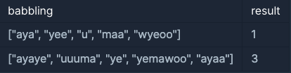 - babbling의 각 문자열에서 "aya", "ye", "woo", "ma"는 각각 최대 한 번씩만 등장합니다.