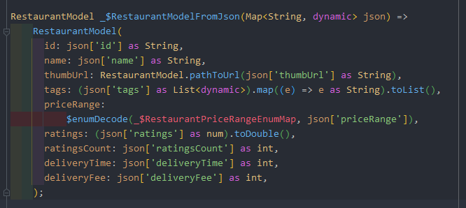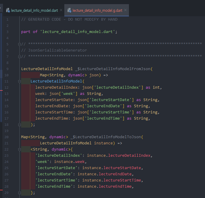 자동으로 생선된 파일을 보면 위에서 직접 했던 작업인 FromJson을 자동으로 만들어줬습니다.