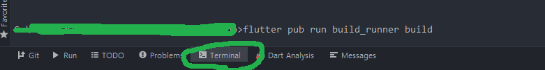 그리고 해당 프로젝트 터미널에서 flutter pub run build_runner build 코드를 작성합니다.