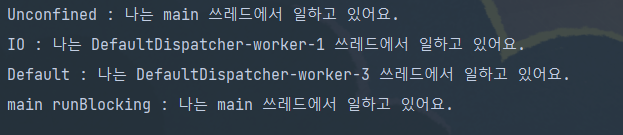 - Dispatchers.Default 와 쓰레드를 공유하고 있다고 한다. - Dispatchers.Unconfined