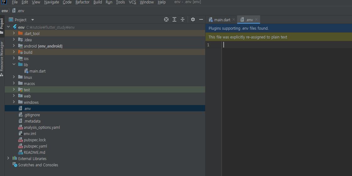 한마디로 dotenv는 Flutter에서 env파일을 관리하고 쉽게 사용할 수 있게 도와주는 패키지입니다.