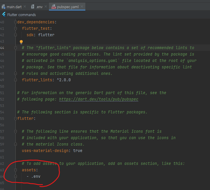 외부 파일인 .env 파일을 프로젝트에서 읽을 수 있도록 pubspec.yaml 에 assets: 에 사진처럼 등록시켜 줍니다.