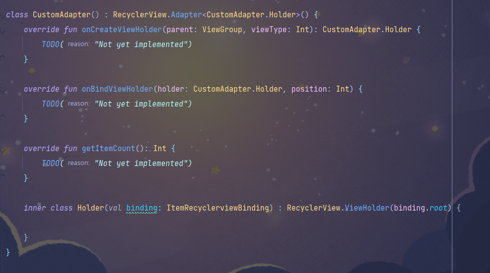 inner class Holder(val binding: ItemRecyclerviewBinding) : RecyclerView.ViewHolder(binding.root) {
